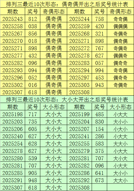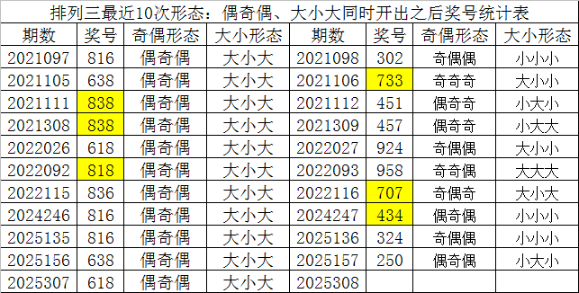 排列三最近10次同时开出奇偶形态:偶奇偶和大小形态:大小大时其奖号分别为:816-638-838-838-618-818-836-816-816-638-618,下期分别开出号码为:302-733-451-457-924-958-707-434-324-250,详细统计见下表: