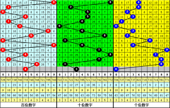 在以上奖号中,下期开奖百位号码统计:奇偶分布分别为:奇-奇-偶-偶-奇-奇-奇-偶-奇-偶,其中奇偶数基本持平,本期百位看好偶数出现;大小分布分别为:小-大-小-小-大-大-大-小-小-小,其中大小 号码基本持平,本期百位看好小 号开出。百位参考号码:4