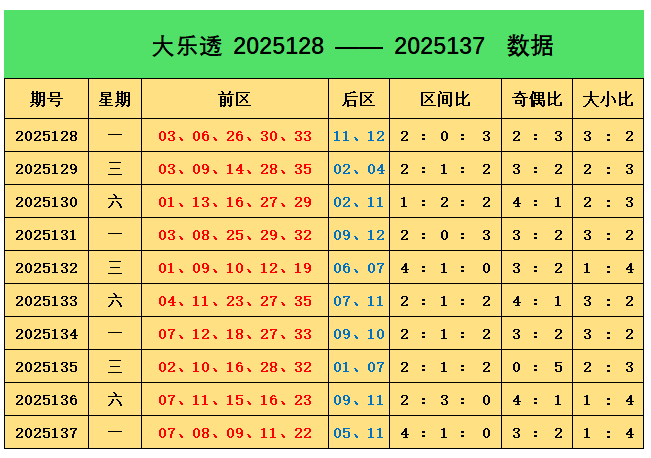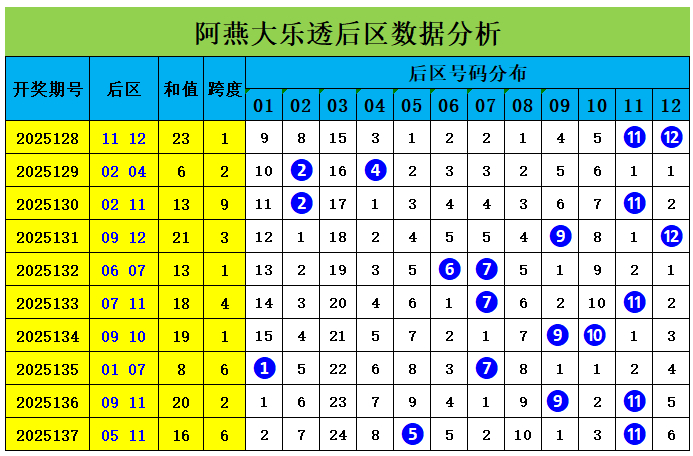 上期回顾:大乐透第2025137期奖号为:前区07、08、09、11、22,后区05、11,前区奖号三区比为4:1:0,奇偶比为3:2,大小比为1:4,后区开出小大组合05、11
